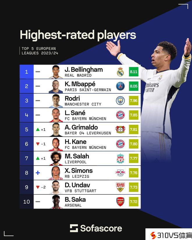Sofascore五大联赛本赛季球员评分榜:贝林厄姆居首,姆巴佩第二