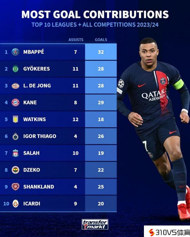 欧洲前10联赛参与进球榜:姆巴佩、吉奥克雷斯、L-德容居首