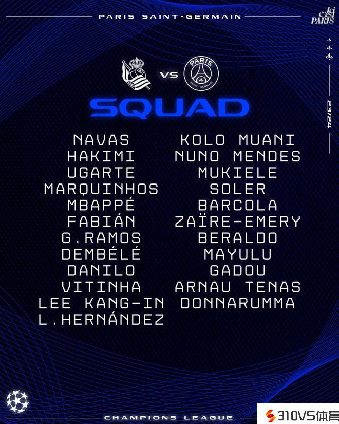 巴黎战皇社次回合大名单:马尔基尼奥斯回归,阿森西奥缺阵
