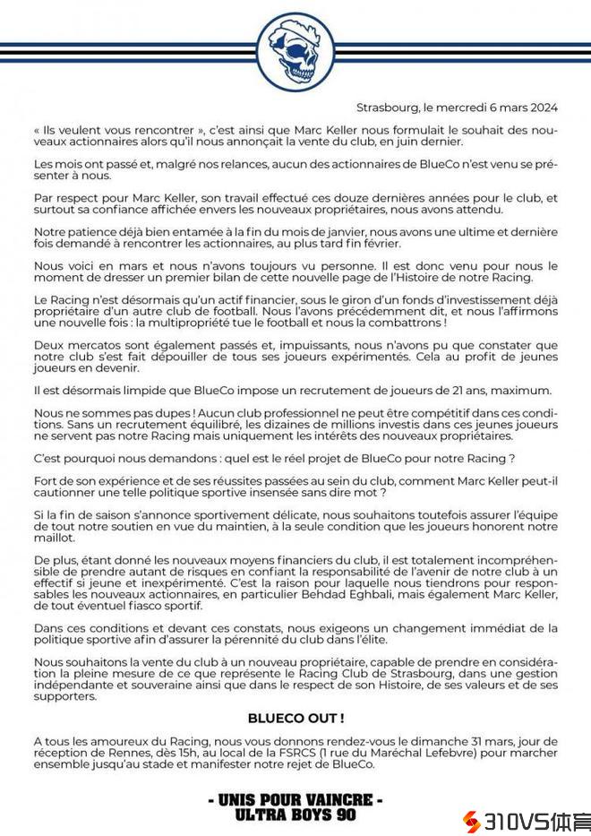 法甲斯特拉斯堡球迷组织Ultra Boys 90日前宣布声明,要求俱乐部一切者清湖资本做出革新。