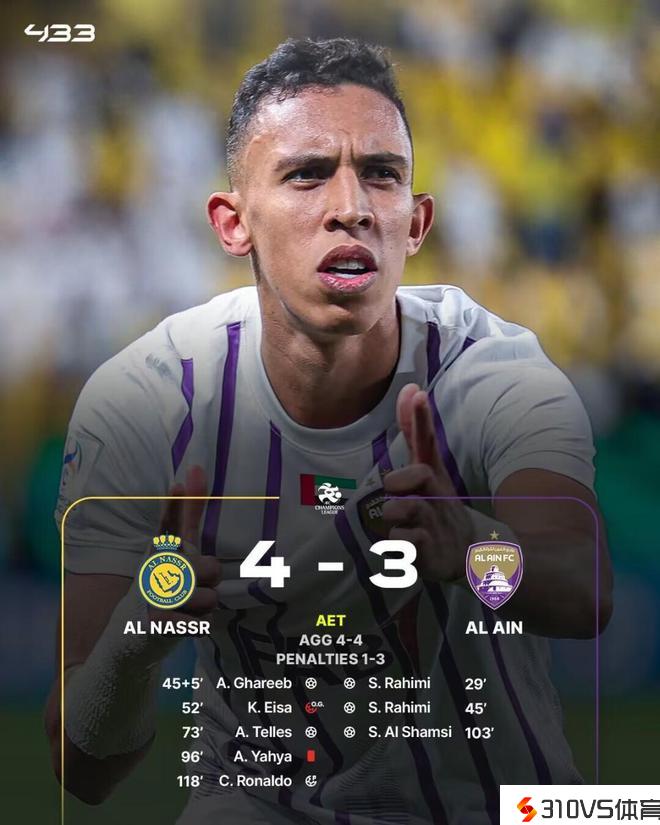 亚冠1/4决赛次回合,利雅得成功经过点球大战5-7不敌阿尔艾因,止步八强。拉希米梅开二度,加里卜扳回一球,奥塔维奥制造乌龙,特莱斯恣意球破门,叶海亚染红被罚下,C罗加时赛第118分钟制造点球并主罚破门,扳平总比分。点球大战,布罗佐维奇、特莱斯和奥塔维奥罚丢,C罗第三个主罚入网。