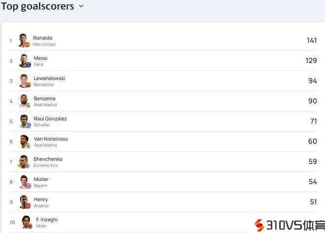 欧冠历史至今,只要两团体的进球数到达百球,区分是141球的C罗和129球的梅西。