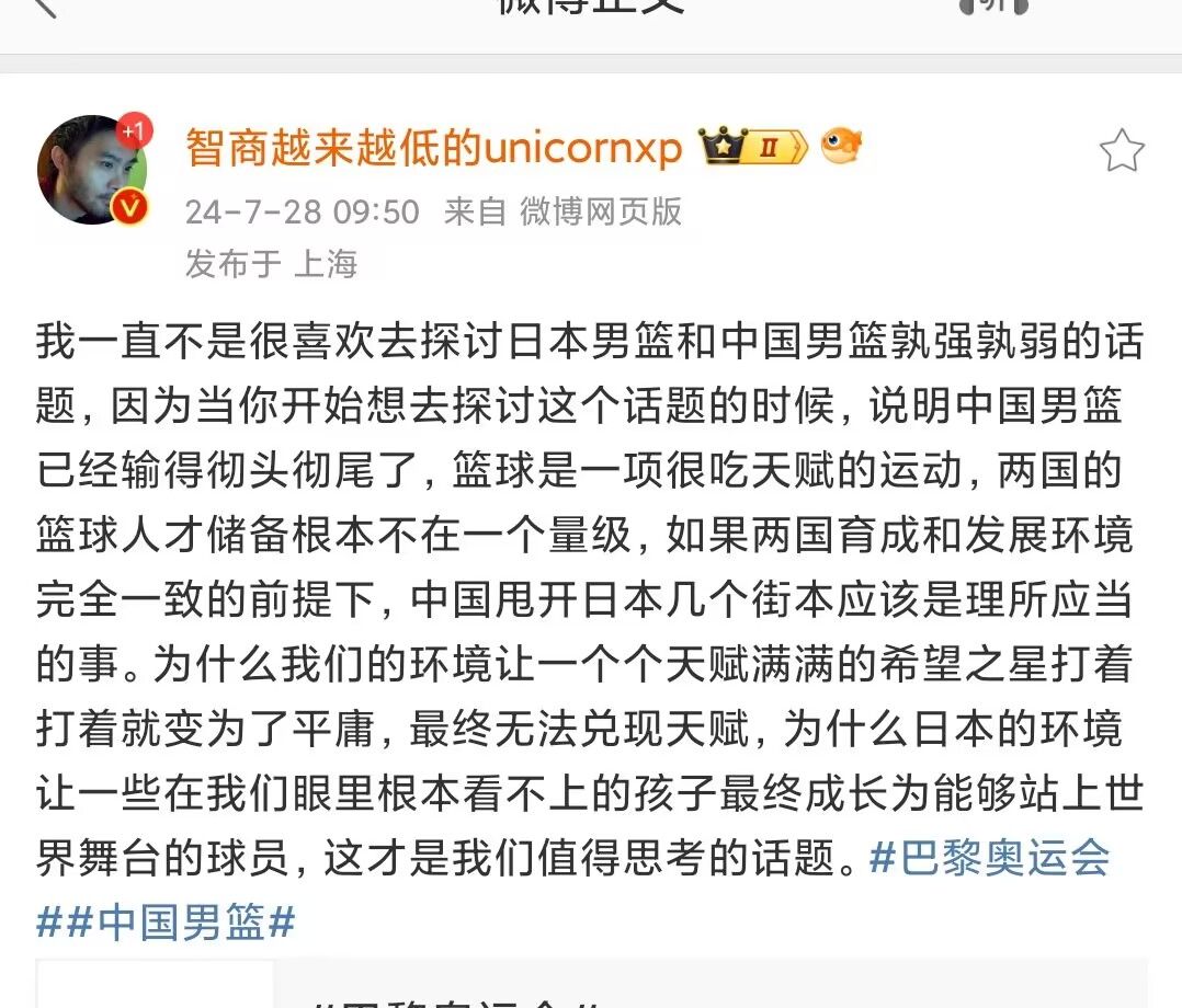 我一直不是很喜欢去探讨日本男篮和中国男篮孰强孰弱的话题,因为当你开始想去探讨这个话题的时候,说明中国男篮已经输得彻头彻尾了,篮球是一项很吃天赋的运动,两国的篮球人才储备根本不在一个量级,如果两国育成和发展环境完全一致的前提下,中国甩开日本几个街本应该是理所应当的事。为什么我们的环境让一个个天赋满满的希望之星打着打着就变为了平庸,最终无法兑现天赋,为什么日本的环境让一些在我们眼里根本看不上的孩子最终成长为能够站上世界舞台的球员,这才是我们值得思考的话题。