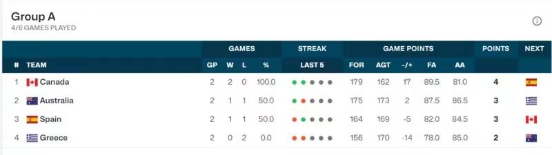 澳大利亚和希腊所在的A组,形式还是比较复杂的,加拿大2胜0负排在第一,澳大利亚和西班牙1胜1负,希腊0胜2负垫底。别看加拿大已经晋级,可他们的最终排名还不确定,甚至有可能跌至第三,澳大利亚和西班牙也都有机会来到第一。这当中的一切结果,也将会在最后一轮中决定,每支球队的命运都握在自己手中。