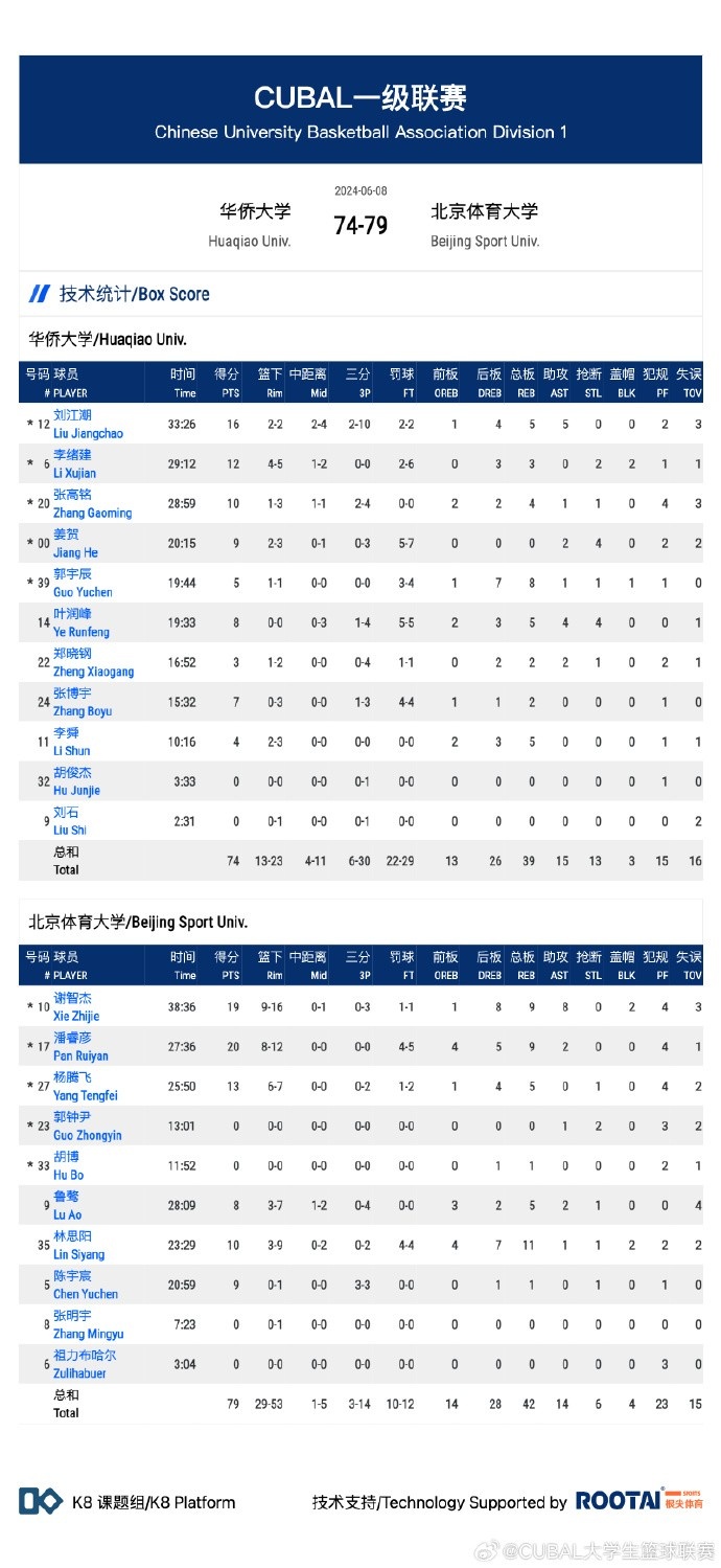 北京体育大学:杨腾飞 13分5篮板、林思阳10分11篮板、陈宇宸9分、鲁鹭8分5篮板、潘睿彦20分9篮板、谢智杰19分9篮板8助攻。