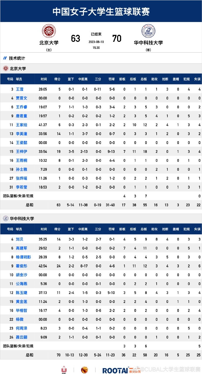 北京大学:王梓伊19分18板、李美潼14分3板、王家绘6分12板、王滢5分3断、王乔睿7分5板3助