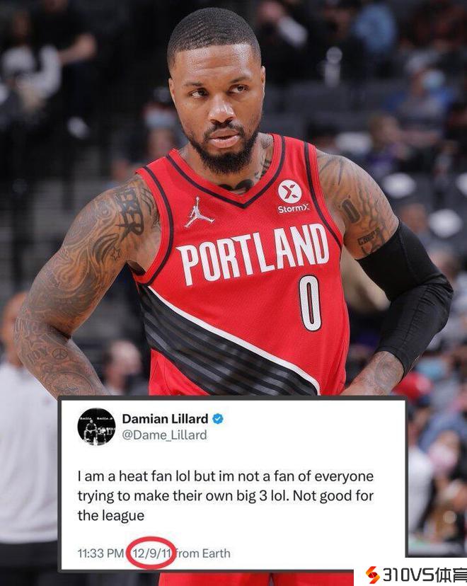 在这条发布于十来年前的社媒里,利拉德写道:“我是一个热火球迷,但我不喜欢大家都尝试组建三巨头,这对联盟是不利的。”显然,利拉德是在抨击事先詹姆斯、韦德和波什在热火抱团的行为。