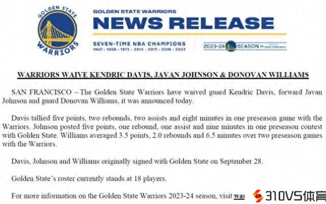 官方:胆小鬼已裁掉肯德里克-戴维斯/贾万-约翰逊/多诺万-威廉姆斯