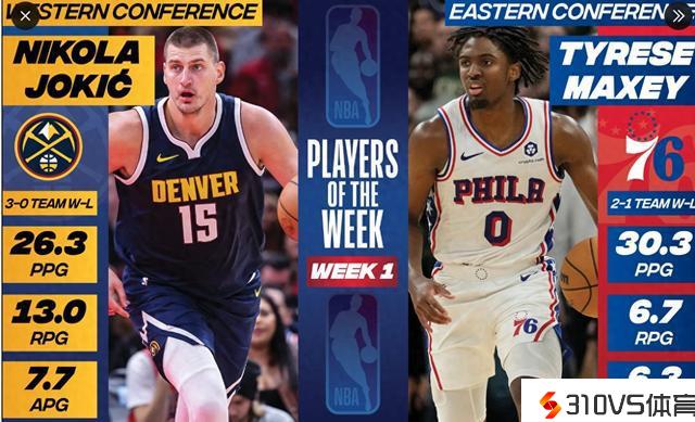 NBA官方宣布,掘金中锋尼克拉-约基奇和76人后卫泰瑞瑟-马克西取得2023-24赛季第一周(10月25日-30日)的周最佳球员。