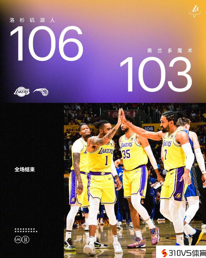 NBA新赛季惯例赛继续停止,洛杉矶湖人队(2胜2负)重拾成功。拉塞尔失掉28分8助攻并在最后时辰命中关键反超三分+两次罚球制胜,戴维斯失掉26分、19个篮板和5次助攻,勒布朗失掉19分,他们率队末节重夺抢先,萨格斯错失扳平三分,湖人队在主场以106-103险胜奥兰多魔术队(2胜1负)。魔术队完毕2连胜遭遇赛季首败。