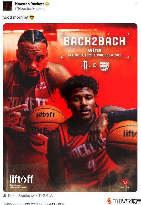 火箭官推晒狄龙&杰伦-格林海报:背靠背连胜国王!早安各位