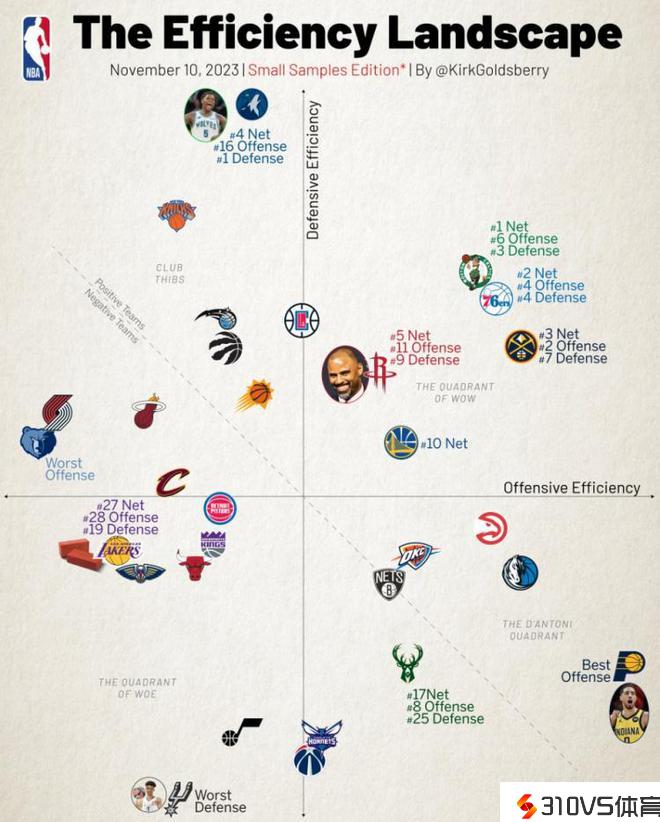 联盟30队攻防效率象限图:绿军76人掘金净效率前三 火箭第五