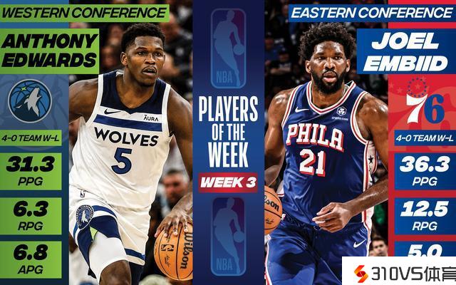 NBA宣布森林狼后卫安东尼-爱德华兹、76人中锋乔尔-恩比德中选本赛季第三周(11月7-13日)的周最佳球员。