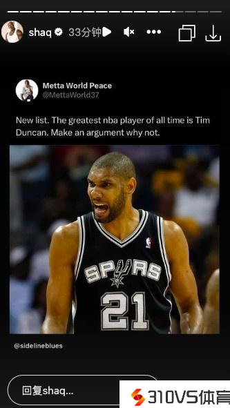 11月14日讯 此前,前NBA球员阿泰斯特曾更推道:“新列表。NBA有史以来最伟大的球员是邓肯。来反驳一下他为什么不是。”