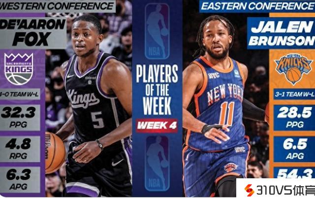 NBA发布国王队控卫德阿隆-福克斯、尼克斯控卫杰伦-布伦森中选上周(11月14-20日)周最佳球员。