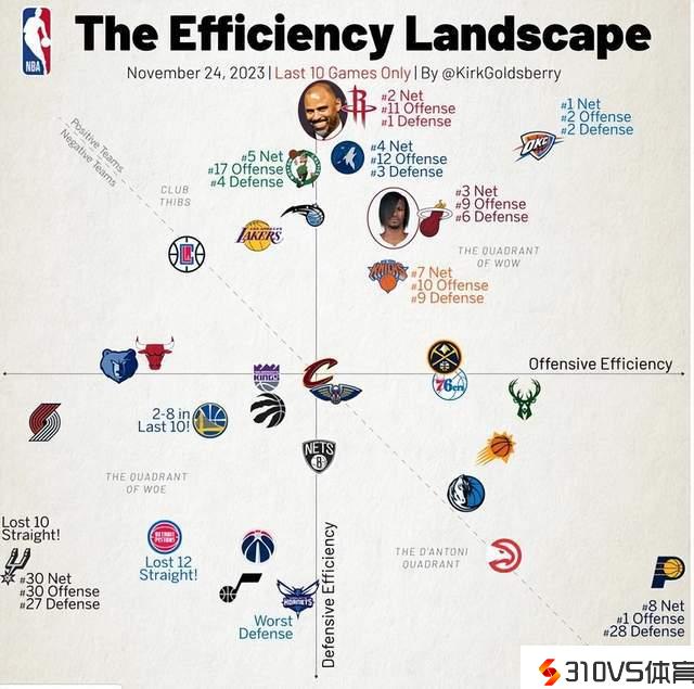 当然本赛季目前为止,火箭曾经两次击败掘金,而且双杀过国王,三个客场延续输球,但都战役到最后一刻。于是经过媒体晒出的过去十场攻防效率象限图,我们发现火箭两数据首屈一指,尤其防卫效率力压雷霆和绿军,高居联盟榜首的位置。虽然火箭进攻稍微差点,只排在联盟第11位,但全体净效率方面,火箭仅次于雷霆,排名联盟第二的位置。