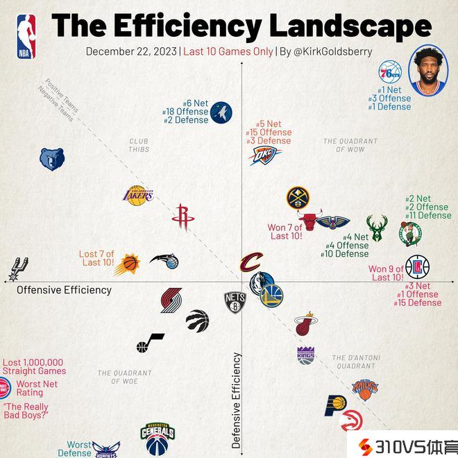 过去10场联盟攻防象限图:76人独一档 快船进攻效率第一