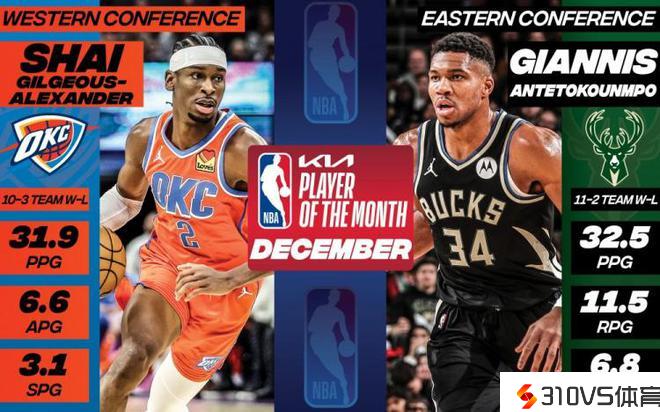 12月最佳球员出炉:亚历山大31.9分3.1断 字母哥32.5分12.5板中选