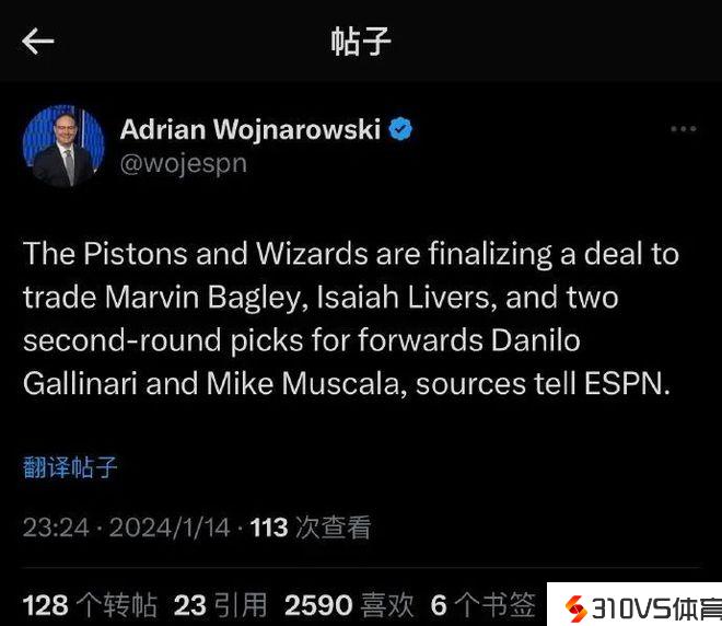 不愿泄漏姓名的记者报道,活塞将巴格利、利弗斯和两个次轮送至奇才,换回加里纳利及穆斯卡拉。