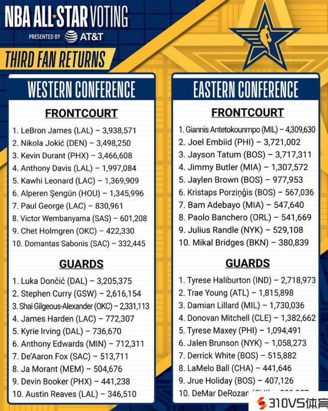 NBA全明星投票第三轮结果:字母哥暂居票王,詹姆斯抢先西部