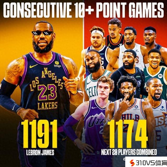 詹姆斯目前延续1191场得分上双 之后20名球员合计1174场