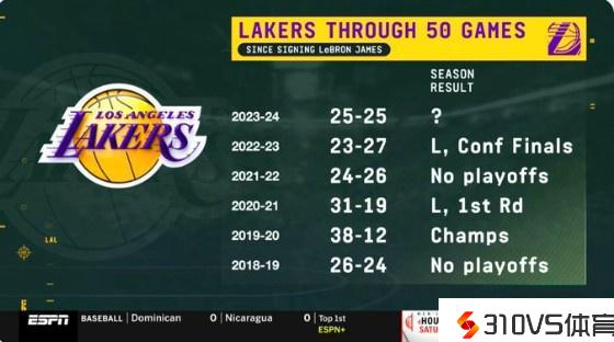 往年能到哪?詹姆斯湖人生涯赛季前50场第四次至少5成胜率