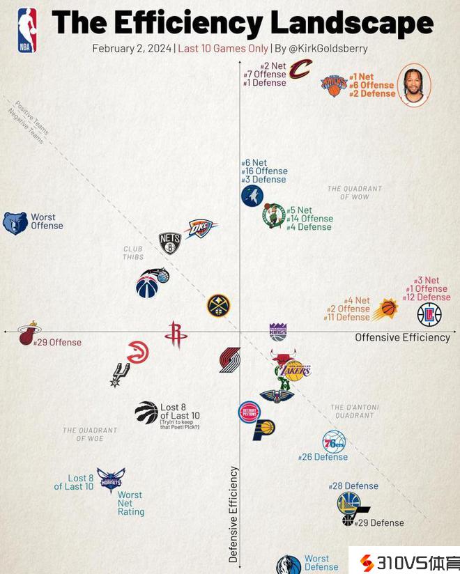 近10场攻防效率图:独行侠防卫垫底 快船进攻最强 尼克斯攻防兼备