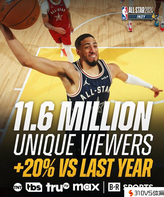 依据统计,在上周日,一共有1160万独立观众经过TNT、TBS、truTV和B/R Sports等渠道上观看了2024年NBA全明星赛,这个数据比去年增长了20%。全明星周末时期,各项竞赛的平均观看人数为550万,这个数据比去年增长了14%。