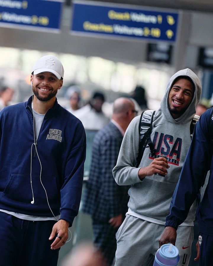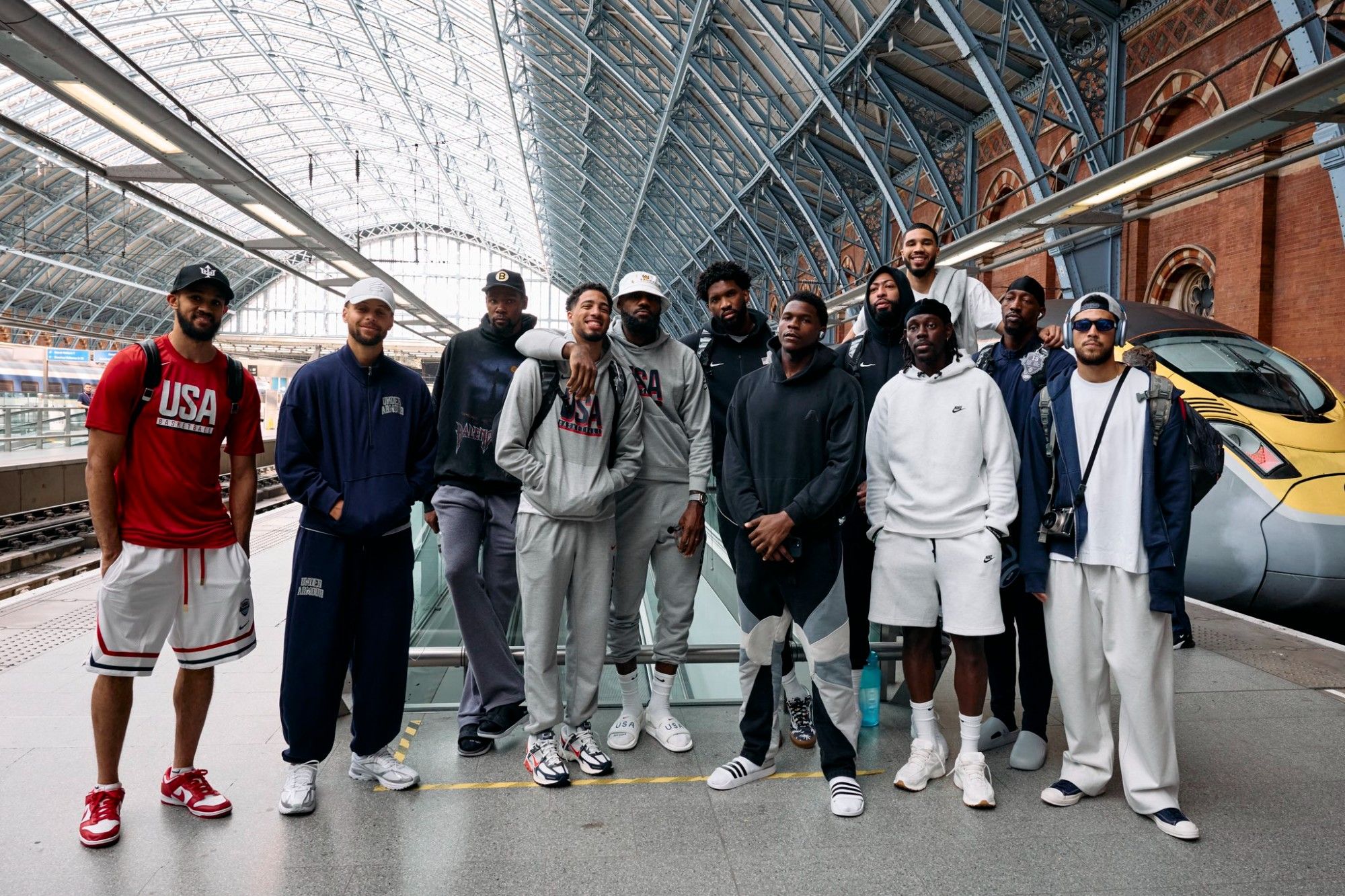 北京时间7月25日讯,今日美国男篮乘坐“欧洲之星”高速列车从伦敦抵达法国里尔。美媒@SLAM发布了美国男篮在车站的合影图。