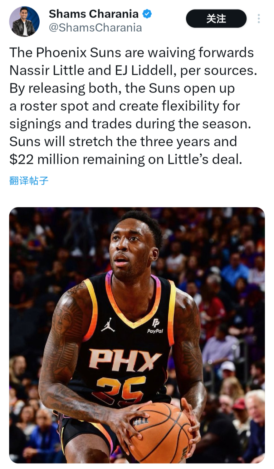 Shams Charania还提到,太阳队将延长支付利特尔剩余三年价值2200万美元的合同,也就是说利特尔未来7年每年差不多可以从太阳获得310万美元的薪水。