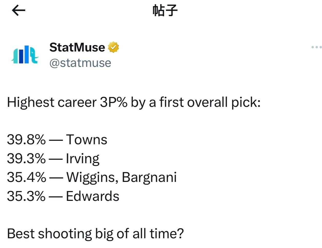 今日,美国著名统计账号StatMuse晒出了一组历史NBA状元秀的生涯三分命中率,其中内线的森林狼核心唐斯居首,欧文紧随其后。