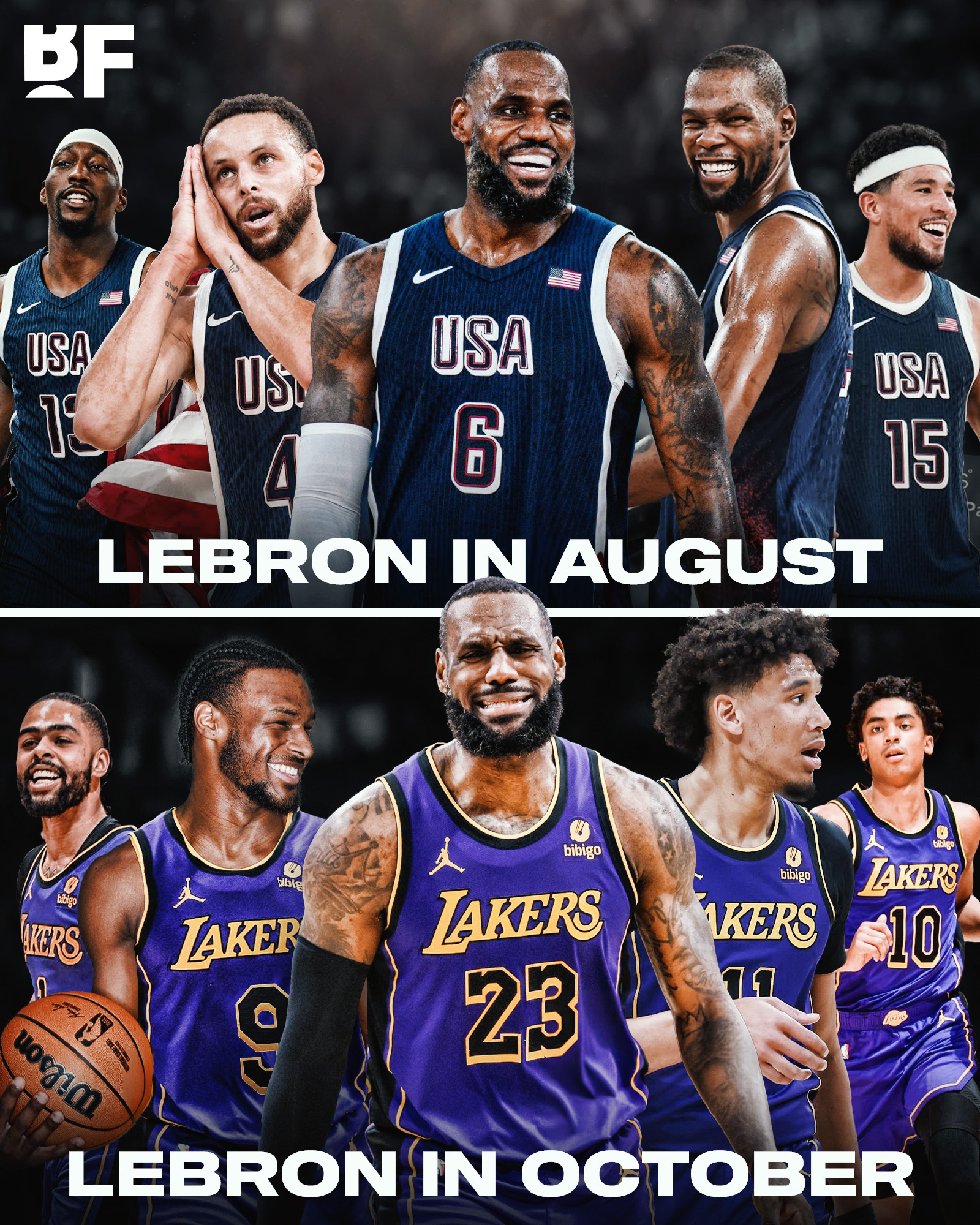 近日,美媒basketball forever制作了一张詹姆斯八月与十月的队友对比图。