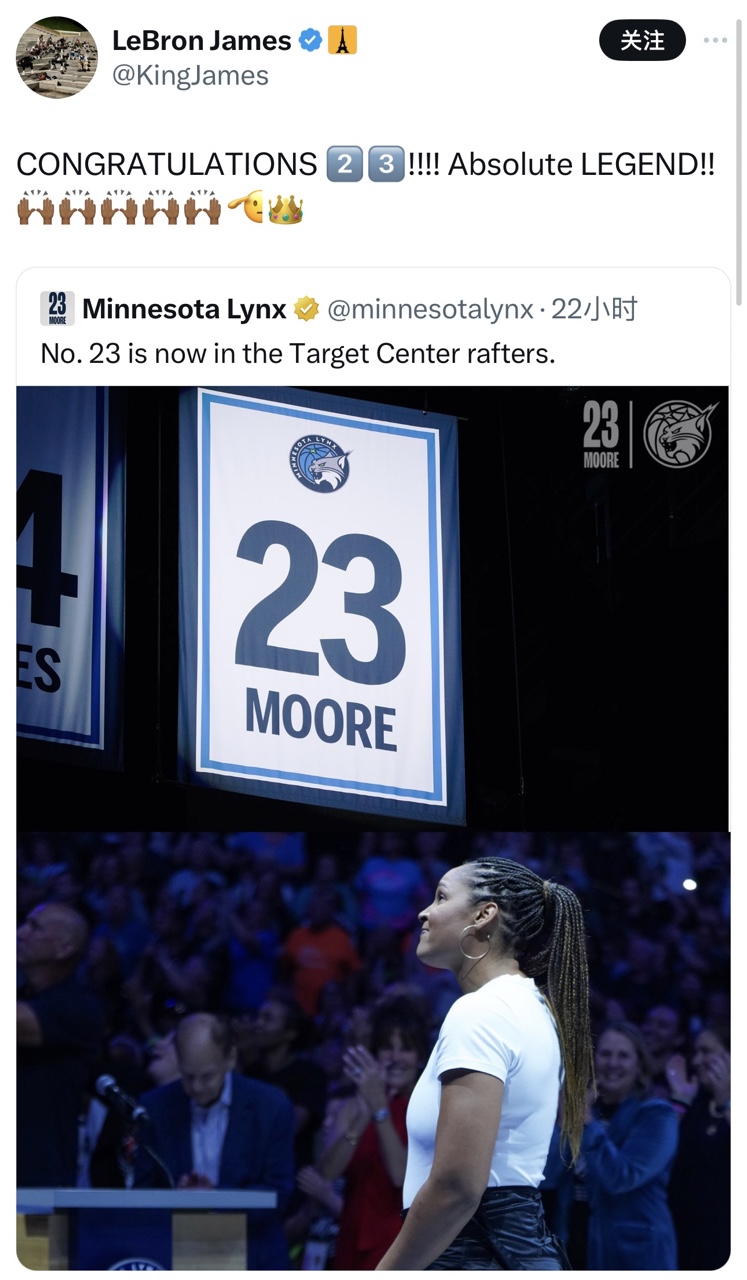 🔥詹姆斯转发玛雅-摩尔球衣退役仪式现场图并配文:恭喜!绝对的传奇👑!