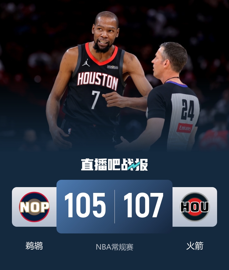 比赛开始,德罗赞·穆雷连得5分为鹈鹕开局局面,杜兰特三分也能回应,双方上来进攻端成功率一般,随后双方对攻,火箭首节领先4分,次节谢泼德连续3记三分扩大领先,但马特科维奇接连护筐助鹈鹕咬住比分,杜兰特连续妙传,火箭半场领先8分。下半场,鹈鹕全民皆兵继续追分,杜兰特站出来有攻有传回应,双方展开拉锯战,第三节双方打成23平,末节鹈鹕11-3一度追平比分,小贾巴里和谢泼德接连三分止血,但锡安暴扣追平后鹈鹕反击补篮反超,小贾巴里关键三分追到差1分,穆雷踩线失误后杜兰特中投反超,锡安发球再失误,墨菲三分绝杀不中,最终火箭107-105险胜鹈鹕。