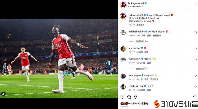 萨卡社媒纪念欧冠首秀:永生难忘的夜晚,回到了属于我们的舞台