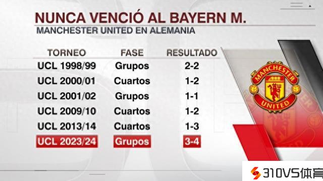曼联6次客场对阵拜仁,战绩2平4负未尝一胜