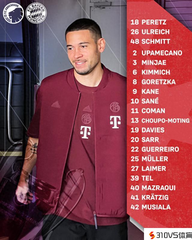 拜仁欧冠客战哥本哈根大名单:凯恩领衔,德利赫特继续列席