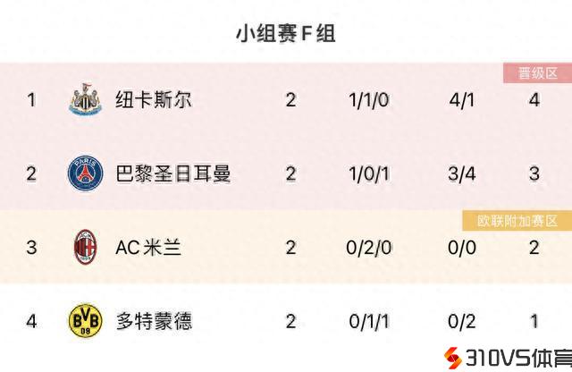 欧冠F组积分:纽卡登顶死亡之组巴黎第二,米兰第三多特垫底