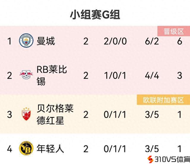 欧冠G组积分榜:曼城两连胜居首莱比锡第2,红星第3年轻人垫底