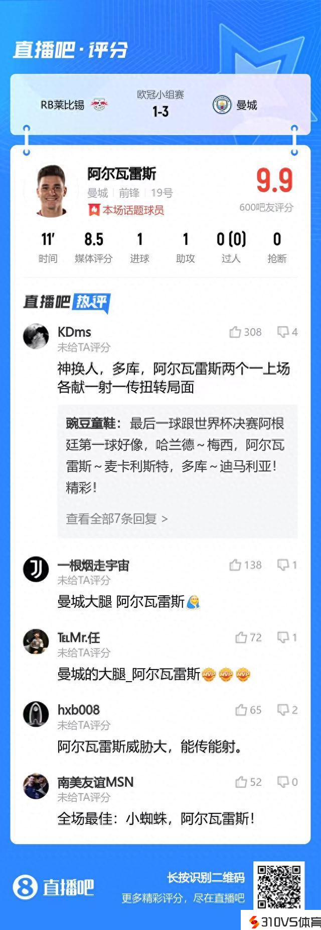 吧友评分 | 小蜘蛛替补退场获9.9分:曼城大腿!能传能射!全场最佳