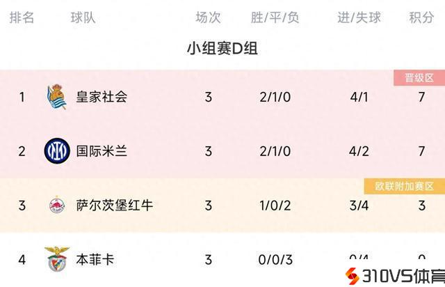 欧冠D组积分榜:皇社、国米同积7分居前二,本菲卡0分垫底