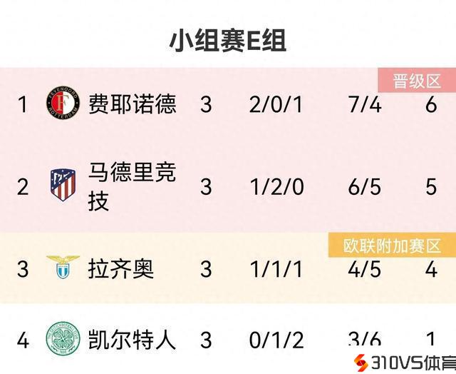 欧冠E组积分榜:费耶诺德2胜1负居榜首,马竞1胜2平第二