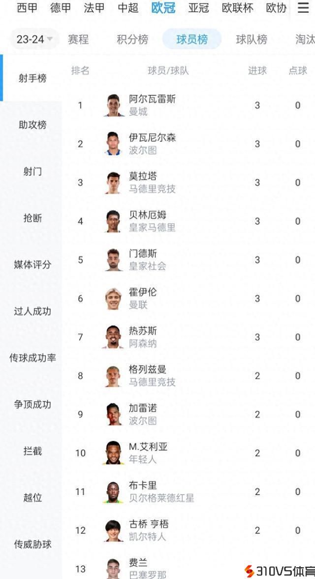 欧冠射手榜:小蜘蛛、莫拉塔、贝林、霍伊伦、热苏斯等7人3球并列第一