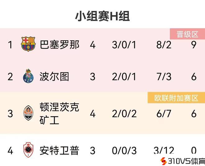 欧冠H组积分榜:巴萨输球仍居第一,矿工先赛与波尔图同分