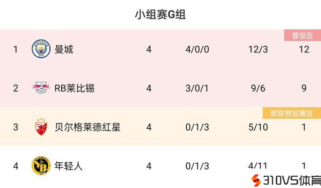 欧冠G组积分榜:曼城、莱比锡携手出线,红星、年轻人同积1分
