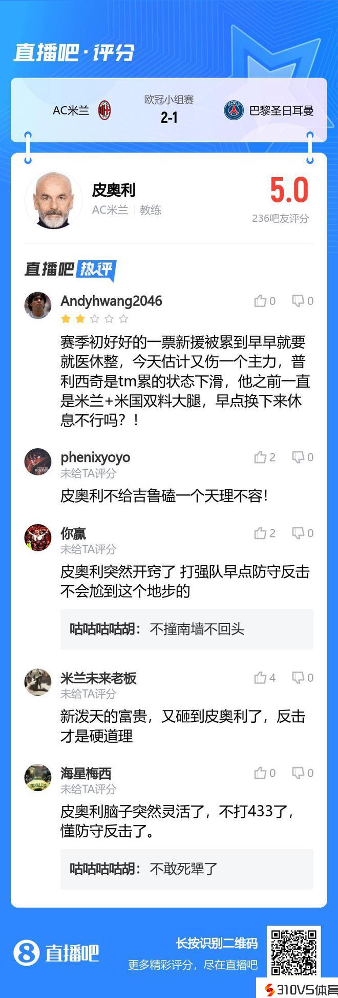 吧友们很严厉!米兰2-1逆转巴黎,皮奥利获评5分