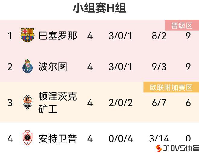 欧冠H组积分榜:巴萨输球仍居第一,波尔图第二与巴萨同分