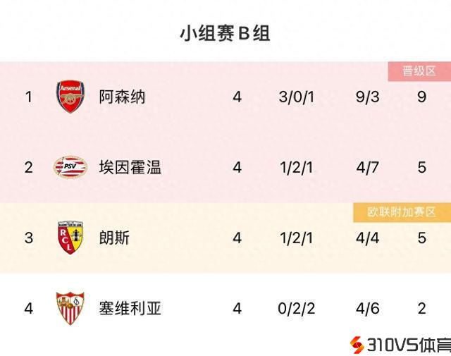 B组积分榜:阿森纳下轮打平即出线,塞维利亚2分垫底