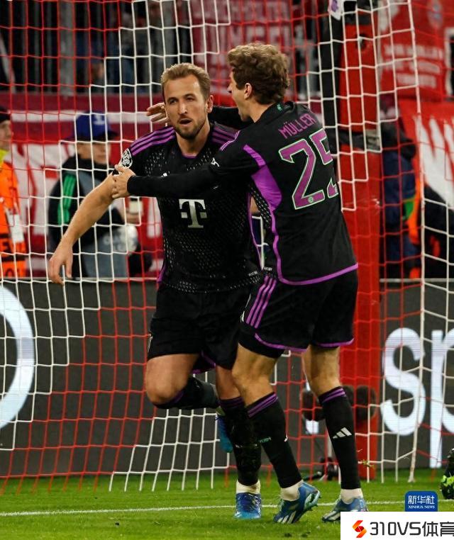 11月8日,拜仁慕尼黑队球员凯恩(左)在进球后与队友穆勒庆贺。
