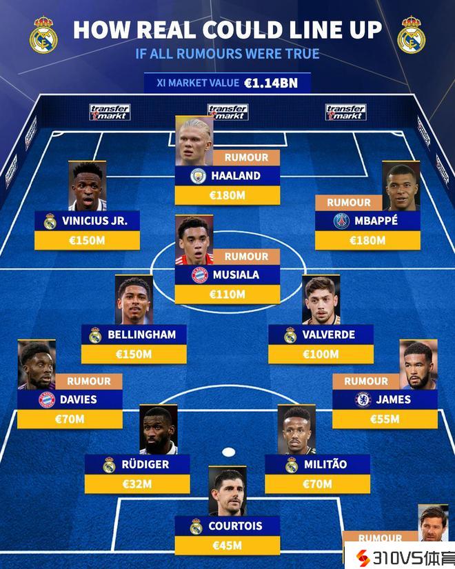 欧冠几连?德转畅想皇马阵容:姆巴佩伙伴哈兰德,穆西亚拉在列